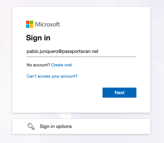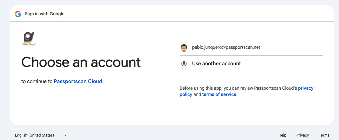 Google accounts: Example: pablo.junquero@passportscan.net → click Sign in with Google (no password required).
