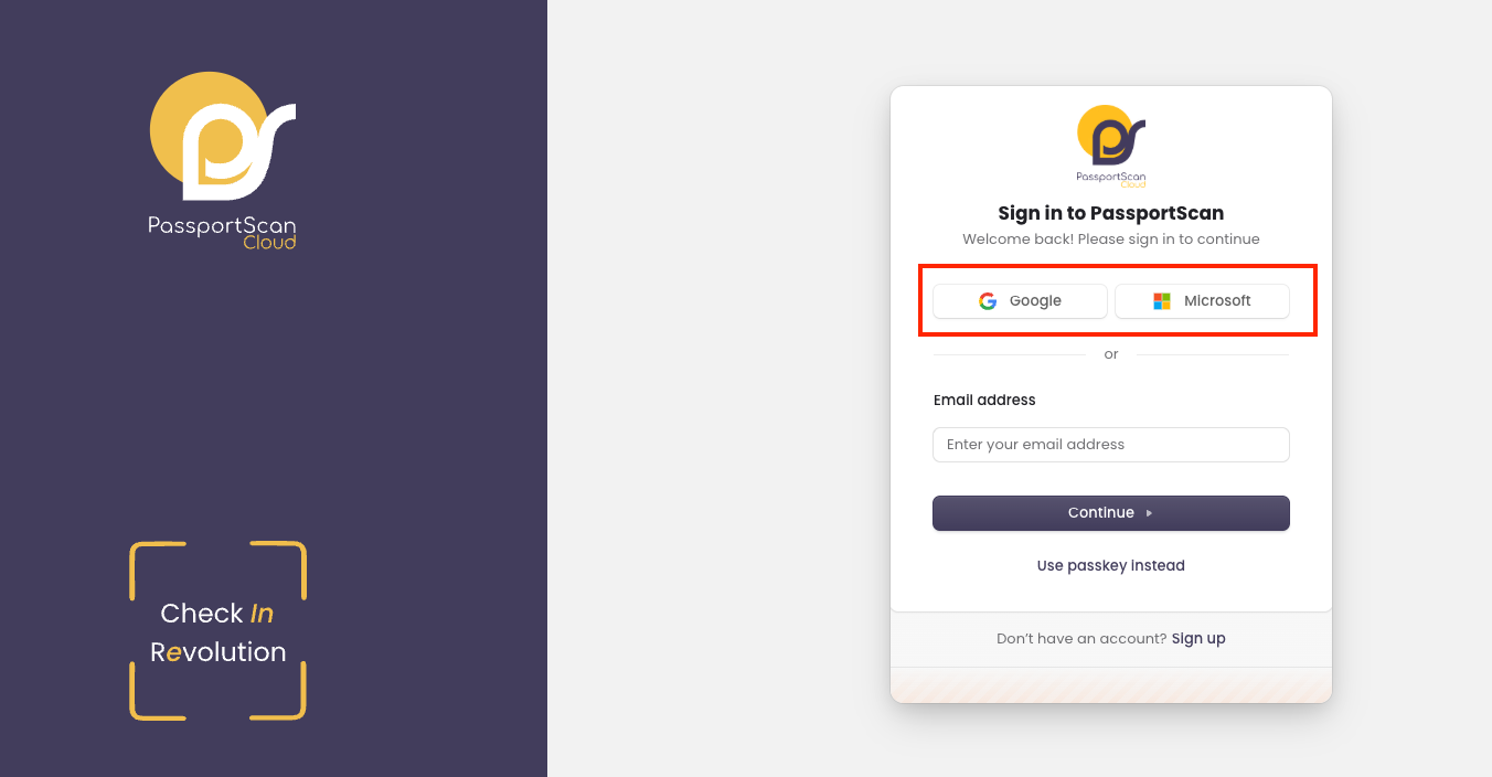 PassportScan Cloud now features a new authentication system that allows users to log in using Single Sign-On (SSO)with Google or Microsoft accounts. This update enhances security, centralizes user management, and gives users full control over their login preferences.